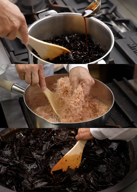調理に使う水は超軟水を使用。カルシウムやマグネシウムが少ない軟水は、昆布と削り節に含まれる旨味成分を余すところなく引出します。調味料はてんさい糖をはじめ、国産天然素材を厳選。昆布や鰹の旨味を引き出す、調味料にもこだわりました。山椒は辛味が優しくフルーティーな香りが特徴の朝倉山椒に限定。本醸造醤油と本みりん、甘味は北海道産のてんさい糖。清酒は灘[白鷹]の純米酒。余分なものを使わず、優しい味わいに仕上げています。