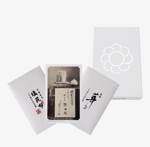 一子相伝の技で受け継がれてきた「塩昆布」のパッケージは、神嵜屋宗兵衛の当主・尾嵜家の女紋を用いています。包装紙は尾嵜家に代々伝わる羽織から引き継いだ「松竹梅の唐草模様」。歴史と伝統で包み込んだ設えです。