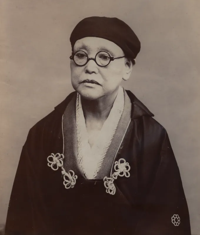 大阪では女紋が代々継承されるという風習がありました。写真の多美は切り髪に帽をかぶり、着物の上に紋の入った被布を着用しています。被布は羽織よりも格調があり、武家の未亡人や御隠居、師匠や宗匠といった身分の人(※2)に着用されました。